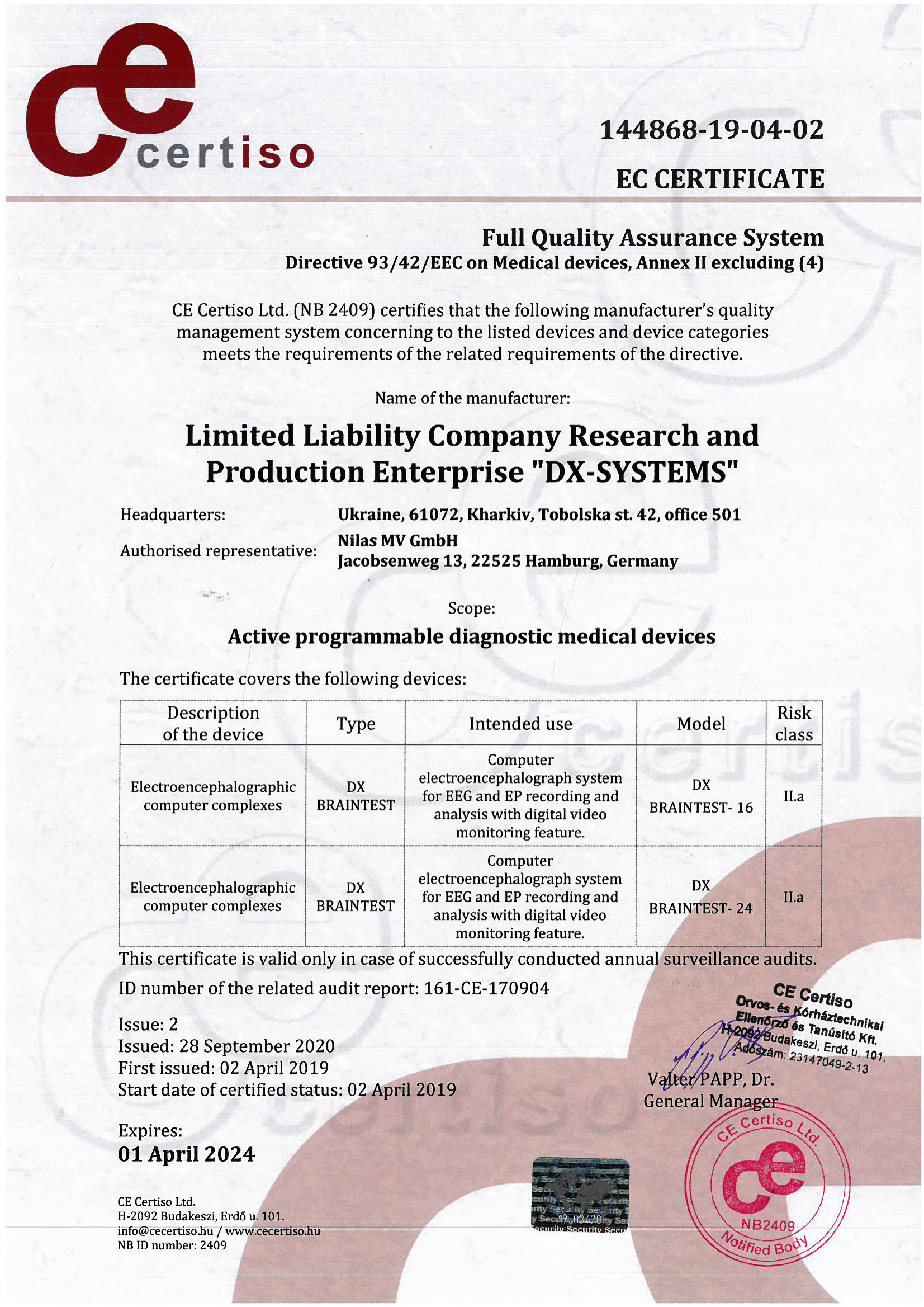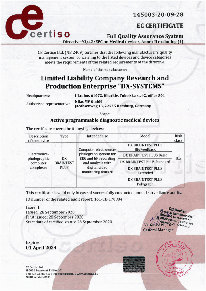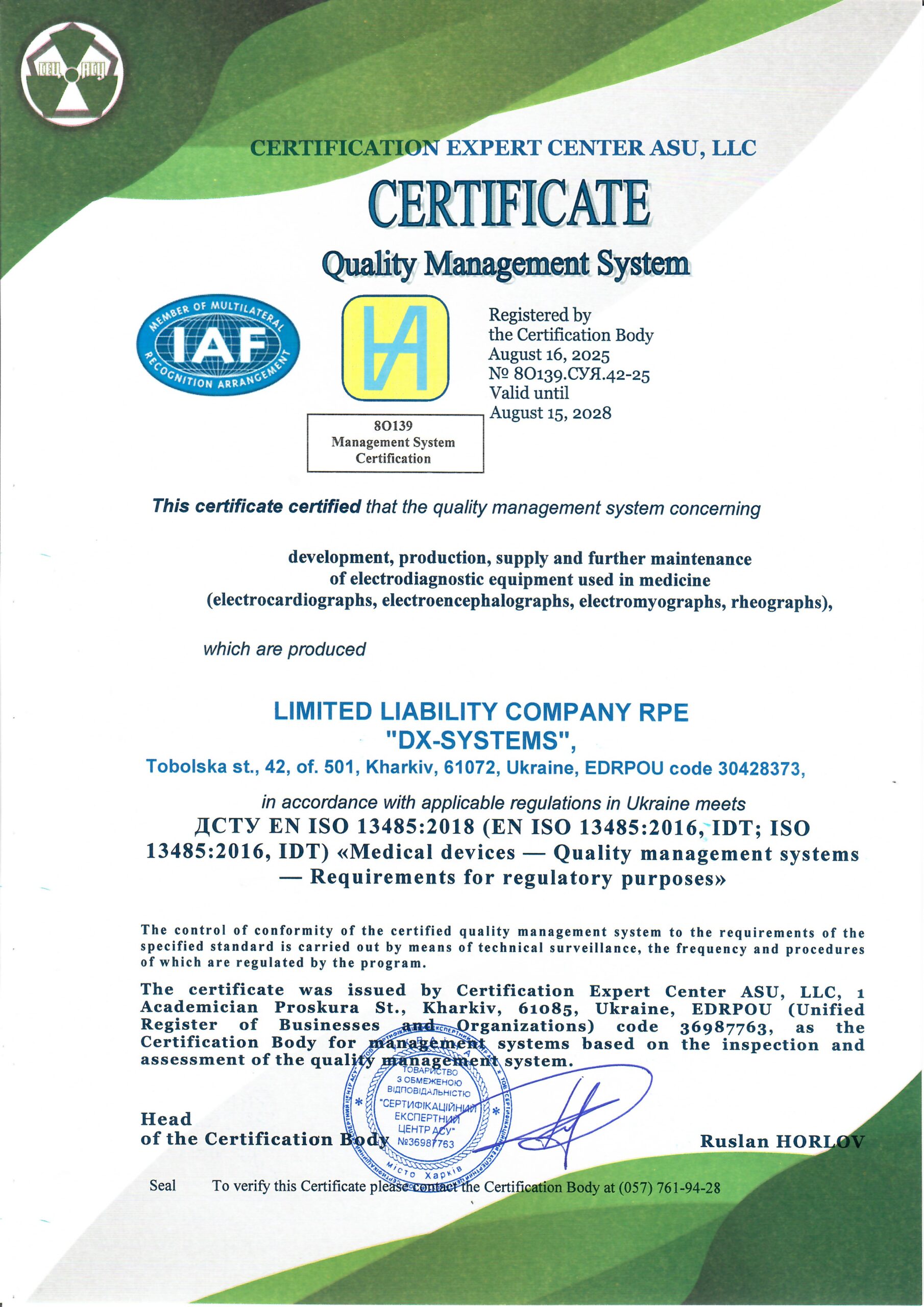 Our company has developed, implemented, and certified a robust quality management system in full compliance with DSTU EN ISO 13485:2018 (EN ISO 13485:2016, IDT; ISO 13485:2016, IDT) – “Medical devices. Quality management system. Regulatory requirements.”