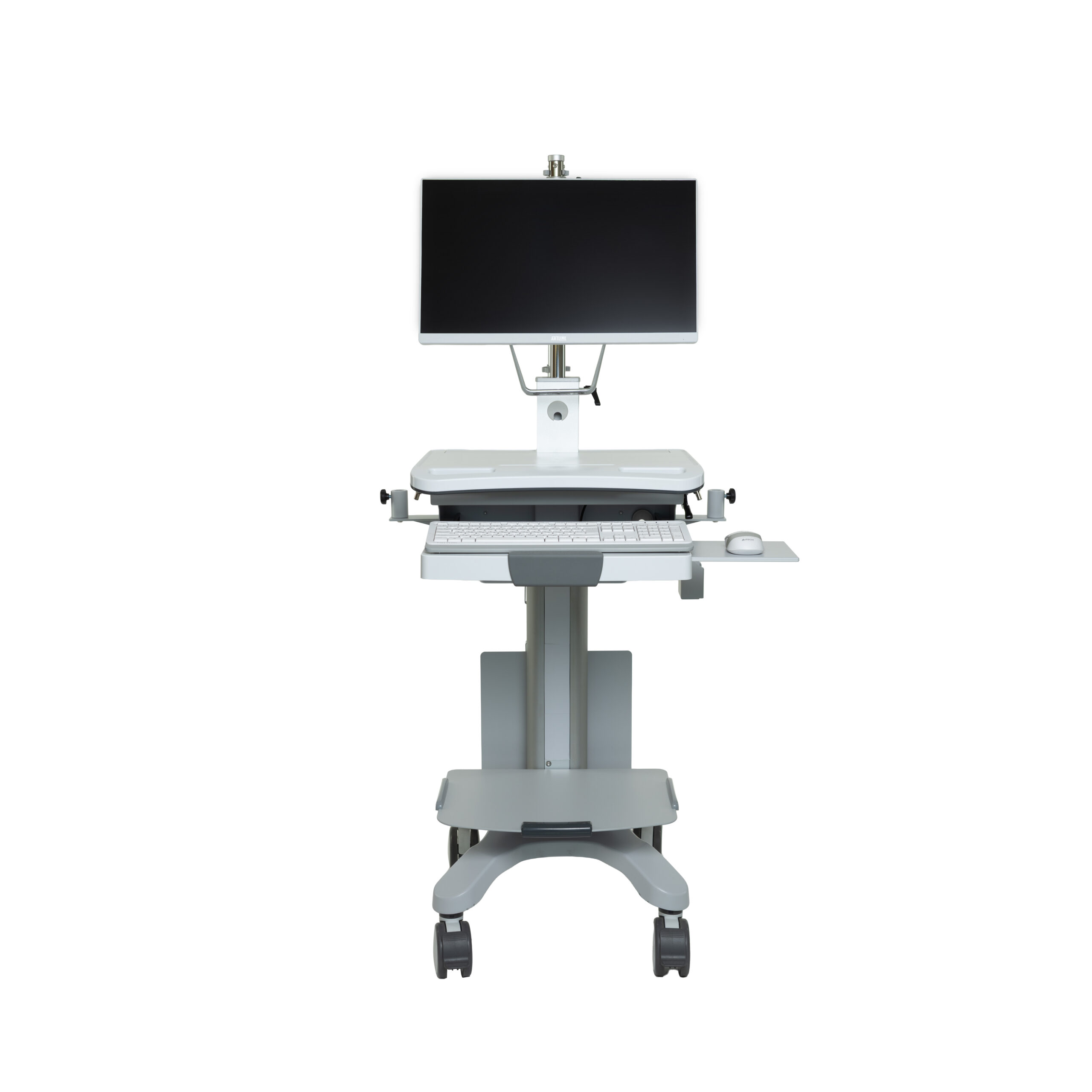 Міцна конструкція та коліщата з фіксацією забезпечують мобільність і стабільність, дозволяючи легко переміщати систему між кабінетами. Регулювання по висоті та продумана компоновка роблять стійку зручною для тривалих обстежень і щоденної клінічної роботи.