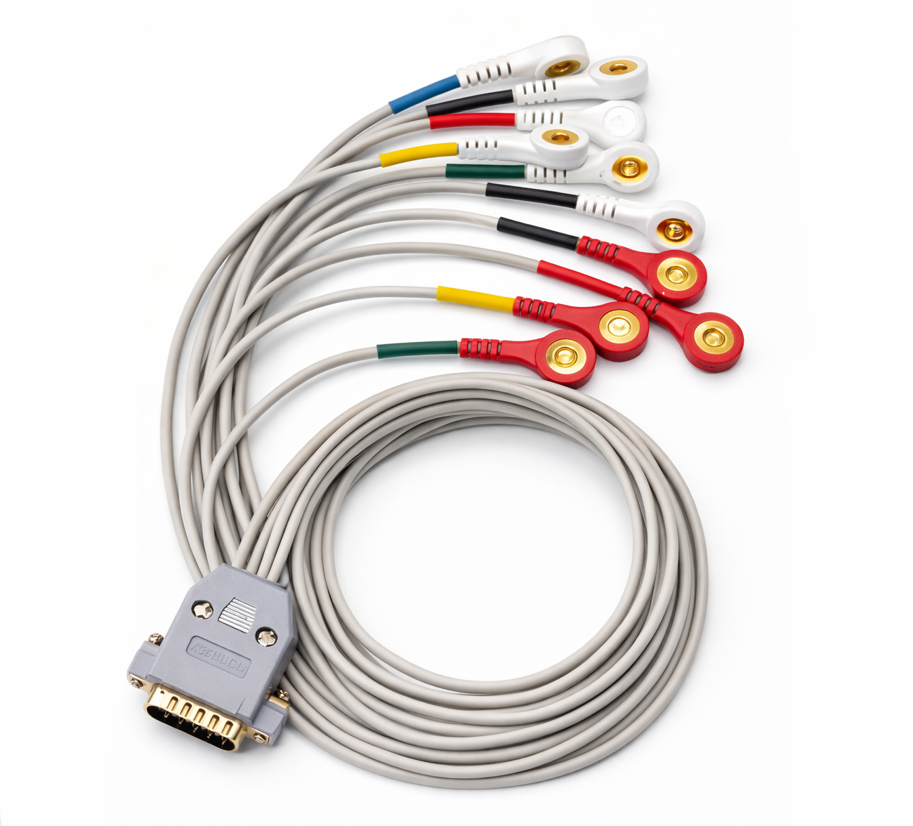 Кабель пациента для ЭКГ с нагрузкой. Применяется с одноразовыми электродами, подключаемыми кабелем типа «кнопка».